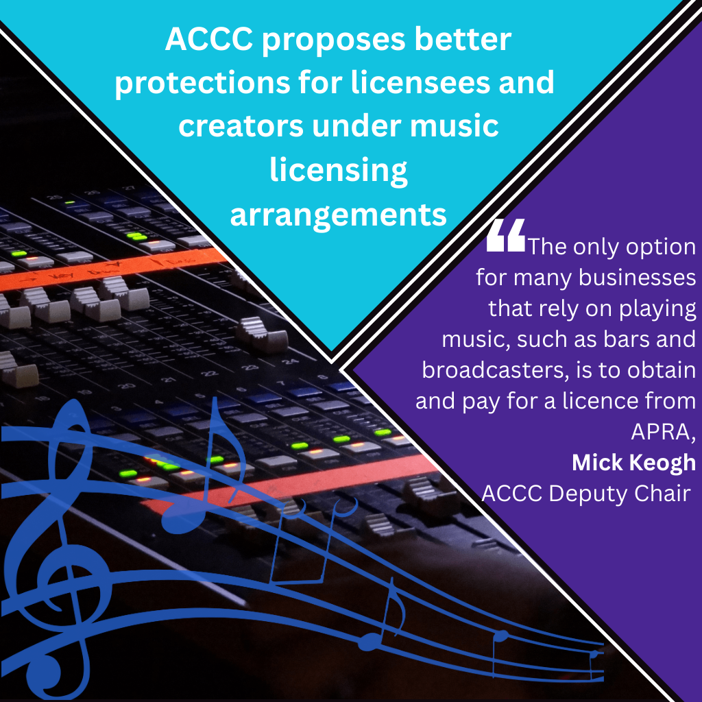 The ACCC has issued a draft determination proposing to authorise the Australasian Performing Right Association’s (APRA) musical works licensing arrangements for five years, subject to stronger conditions aimed at improving the association’s accountability and transparency.